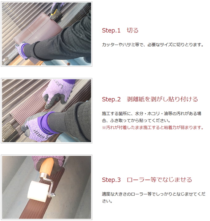 必要なサイズに切って手で貼るだけ!強力な粘着力で複雑な形状の箇所も簡単補修!