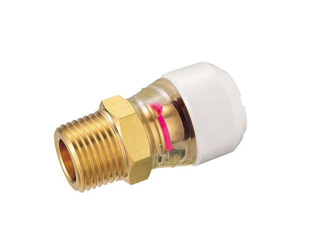 差込み確認ラインまでパイプを挿入すると、ピンクの段付リングの段差がなくなりリングが平らになることで接続完了の確認ができます。透明ボディーでパイプの挿入状態が目視で確認できます。