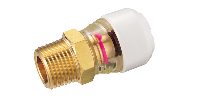 差込み確認ラインまでパイプを挿入すると、ピンクの段付リングの段差がなくなりリングが平らになることで接続完了の確認ができます。透明ボディーでパイプの挿入状態が目視で確認できます。