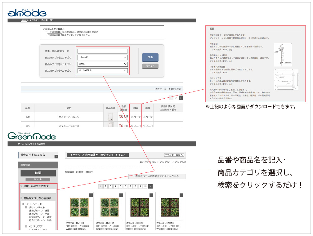 アルモードでは商品図面・画像・取扱説明書を、グリーンモードでは画像を