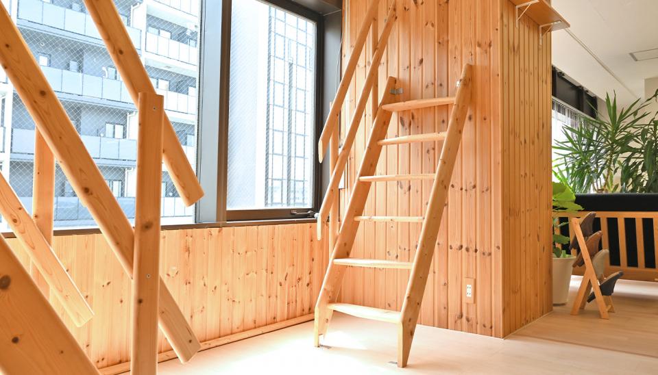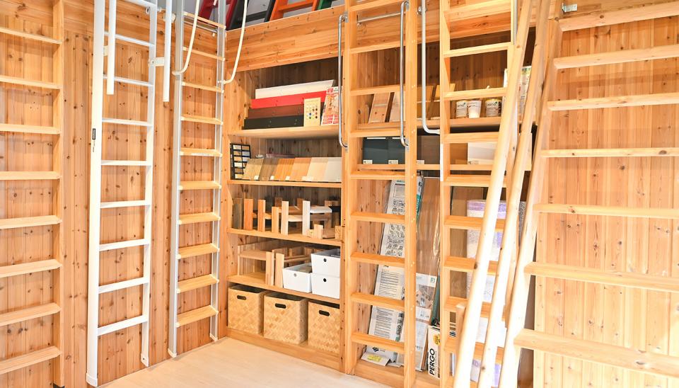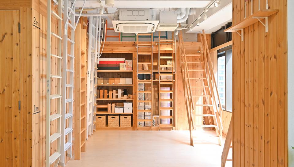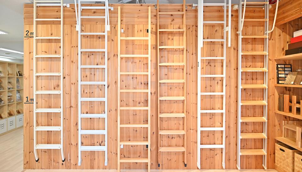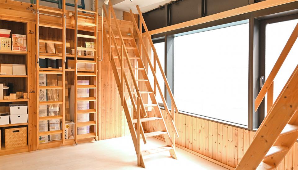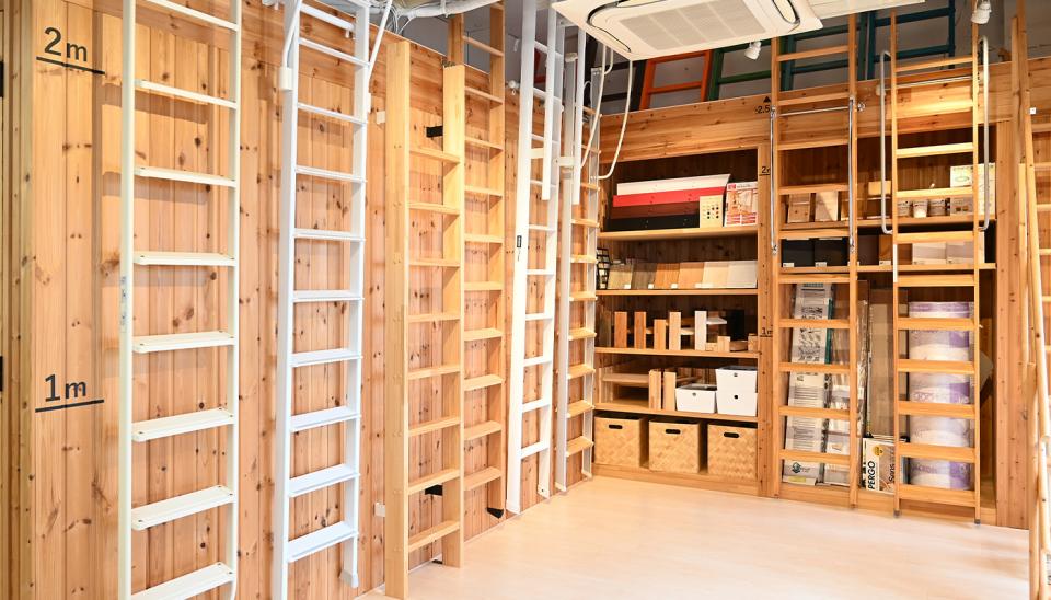 新横浜のベストワン事務所内に展開。当店で扱う全ての木製・金属製はしごと木製階段を展示しており、実際に昇降や比較が可能です。