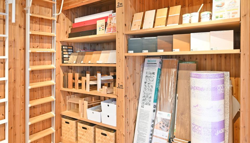 板材は羽目板とラミネートフロアの一部をご覧になれるほか、全商品のカットサンプルをご用意しています。ご来場の際は、下記ボタンより事前にご予約ください。