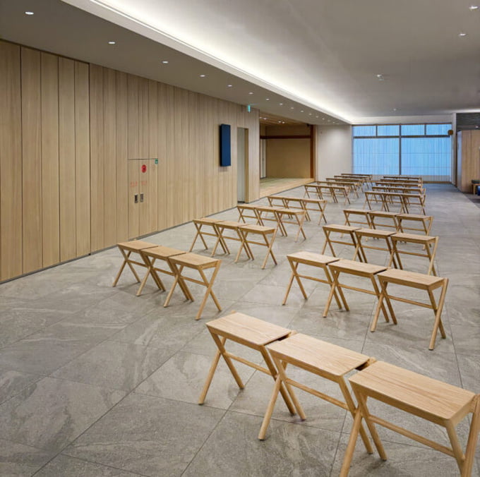 参集殿に増築されたエントランスより入ってすぐに見える待合エリアのスツールです。