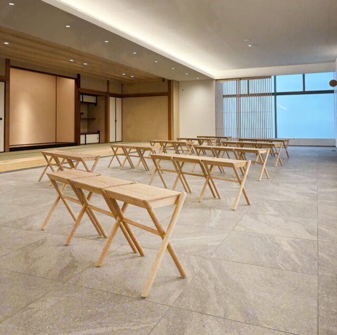 国内の神社で見られる胡床と呼ばれる折りたたみが可能な椅子がモチーフになっています。