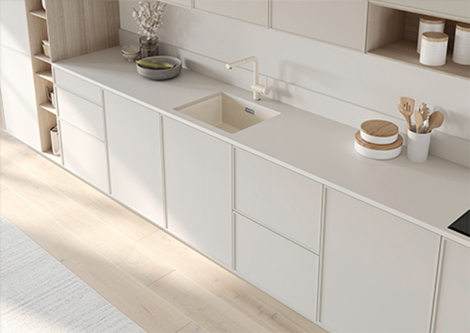 硬度が高く、耐久性に優れたクォーツ素材を使ったキッチンシンクです。傷が付きにくく、お掃除のしやすさも抜群です。またコーディネートしやすいカラーが揃う豊富なカラーなバリエーション、空間に馴染むシンプルで飽きのこないスクエアデザインもおすすめのポイントです。