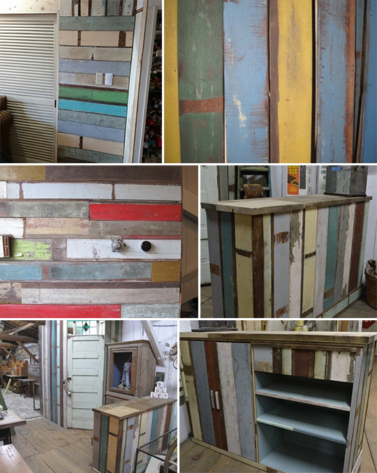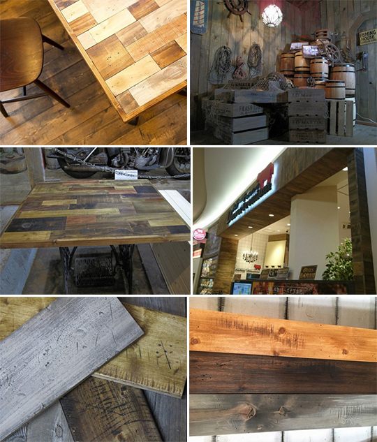 新建材の表面を全てが手作業の特殊加工技術により、ビンテージ加工、特殊技法によるエイジングで風化した木目、質感、濃淡等をリアルに再現した素材です。表面の色目を変えることにより、ミックスウッドとして壁面や什器等に合わせて使用することができ、コストパフォーマンスを実現できる商材です。