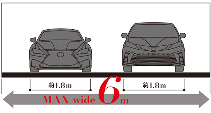 最大間口Wは6m、Hは3mまで対応可能です。車2台分のガレージでも1連で対応できるので、柱のないスッキリとした空間が実現できます。耐風圧性能は正圧・負圧ともに800Paと、ガレージ用オーバースライディングドアでは最高性能を誇ります。(2021年6月現在)