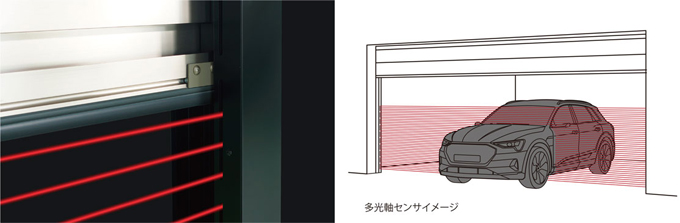 レールに内蔵された多光軸センサで開口部の障害物を感知。もしもの時でも人や車両等に接触することなくシャッターが停止します。また電源は本体側から供給しているため電池交換は不要です。