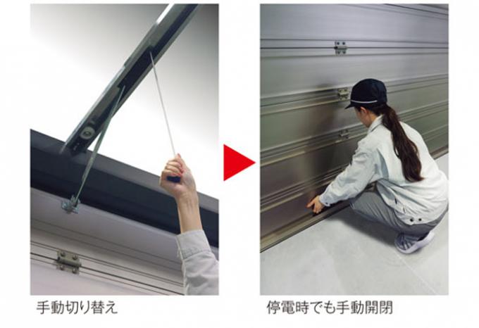 手動切り替え用の紐を引くだけでワンタッチで手動開閉に切替え。停電時に手動で開閉することができます。