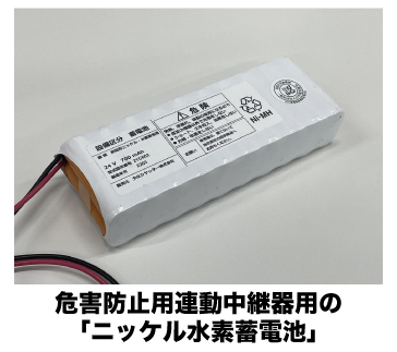 この連動中継器用の予備電源にはこれまで、交換時期が約5年の「ニッケル・カドミウム電池」を採用していましたが、このほどカドミウムを使用しない「ニッケル水素蓄電池」に変更したことにより、環境への負荷低減を図っています。
