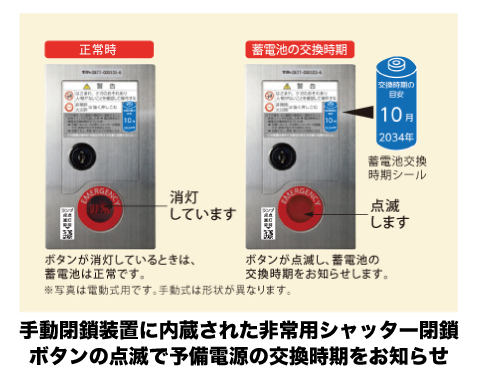 ◆予備電源の交換時期を手動閉鎖装置の非常用シャッター閉鎖ボタンの点滅でお知らせ