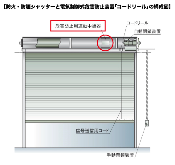 防火・防煙シャッターは、火災による煙や熱を感知すると自動で閉鎖し、煙の拡散や延焼を防ぐために設置される特定防火設備です。この防火・防煙シャッターが閉鎖中に火災や停電により一次側電源が切れた場合でも、人が挟まれる事故を防止する危害防止装置が正常に作動するよう、危害防止用連動中継器(以下、連動中継器)には予備電源が内蔵されています。