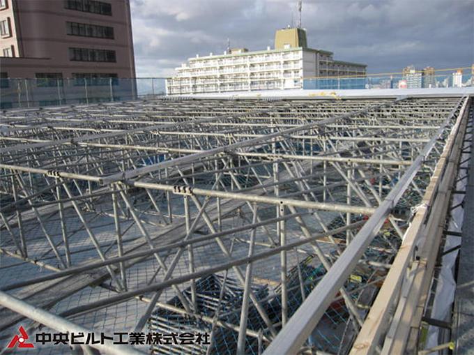 ロングスパンで強度のある仮設屋根、作業ステージ、移動構台、渡り通路など様々な用途に、簡単な組み立てで施工できることに特長があります。