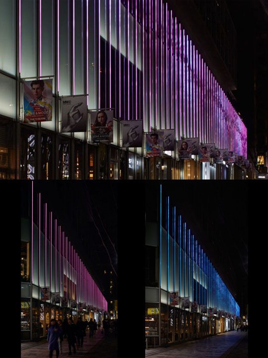 既存のガラスサッシの縦ラインを利用し、最長7.2mの光のラインが90本並ぶ構成となりました。
