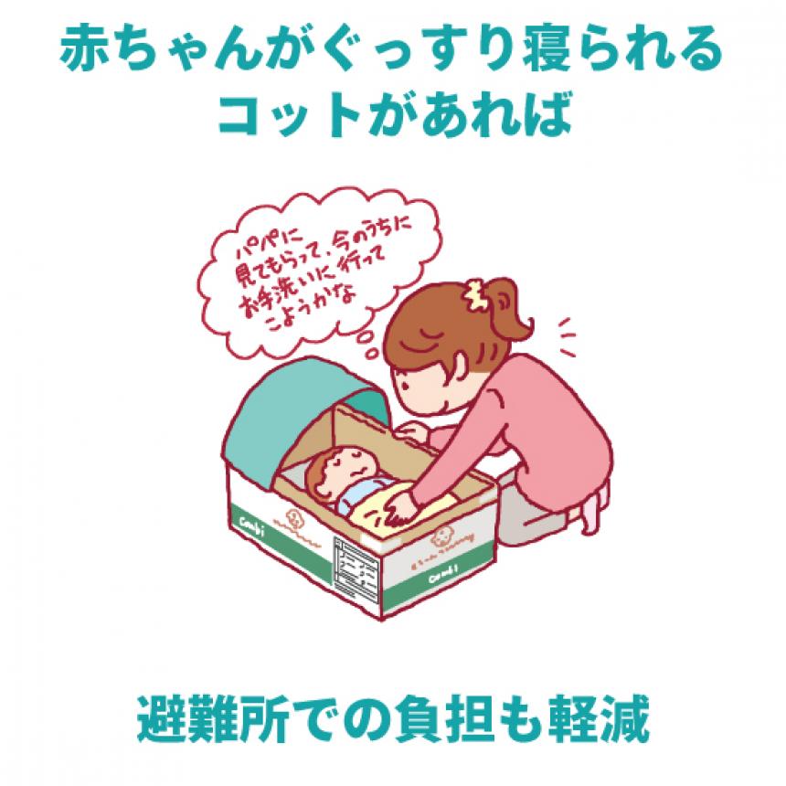 そこで工具なしで組み立てられる避難所用防災備蓄品、段ボール製乳児用コットを新発売しました。