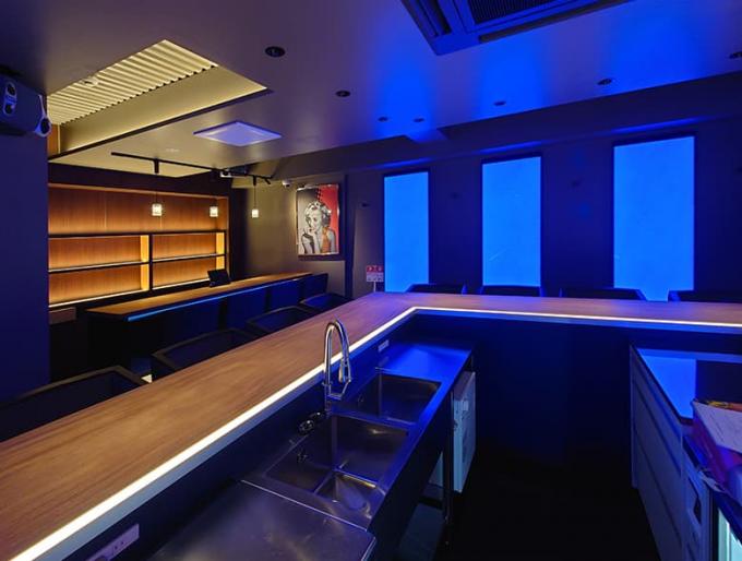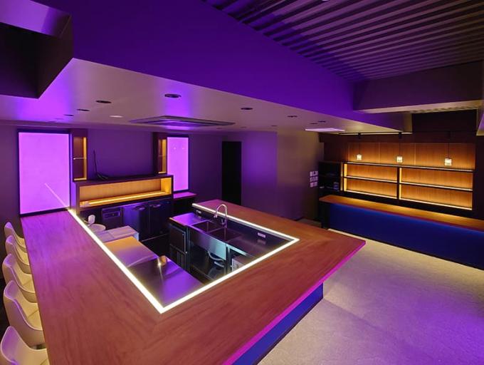 店舗内に光壁と光棚を設置いたしました。RGBで調光させることで店舗内に光の動きを付けました。