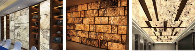 Lumiオニキスは、薄型自然石資材シートを独自技術でLED内蔵導光板に付着させユニット化した光る自然石です。薄型でありながら大判サイズ製作が可能なことで、カウンターや光り壁としてご使用いただけます。また、LED内蔵導光板の色温度や調光・調色で自然石の風合いの選択が広がることでさらなる光り演出が楽しめます。