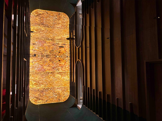 カウンターや光り壁に「光る自然石 Lumiオニキス」