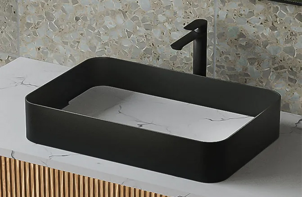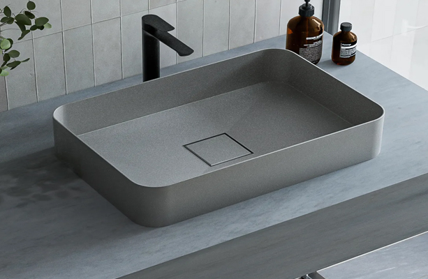 石目調の底板を併用することで天板と一体化し、排水口の見えないすっきりとした空間を実現。金属の質感を活かしたマット塗装仕上げは、洗面空間はもちろん手洗いニーズの増えたパブリック空間にも調和します。