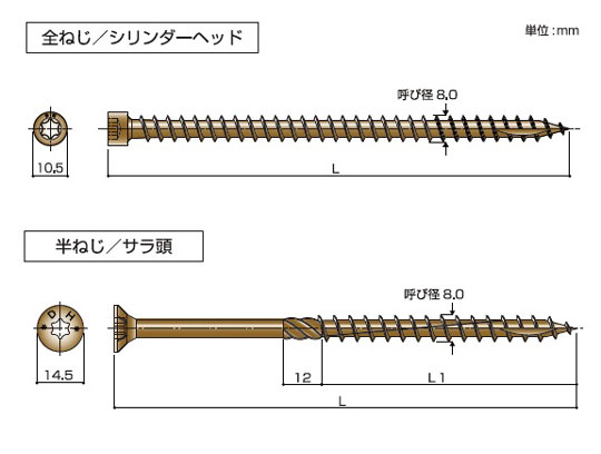 ・全ねじのシリンダーヘッド仕様と半ねじの皿頭仕様をラインアップ。