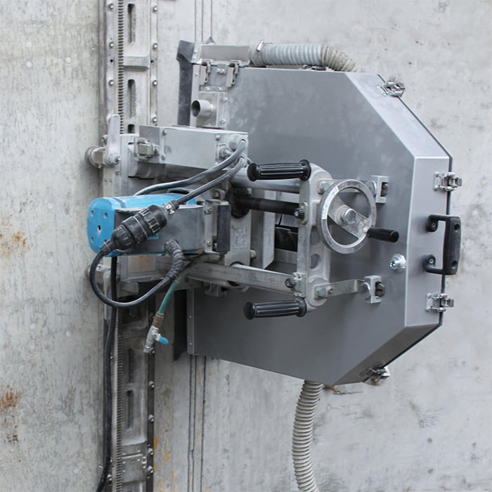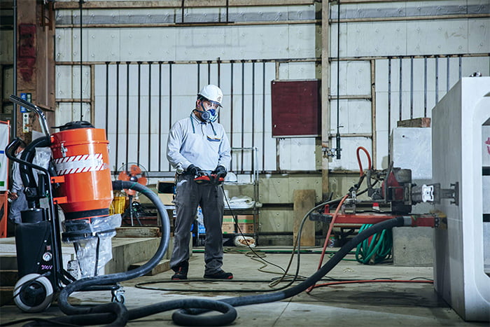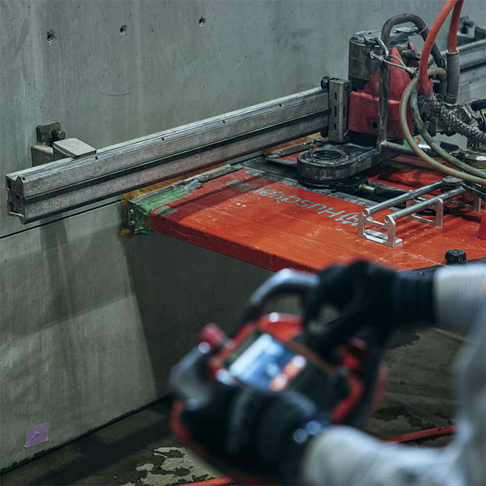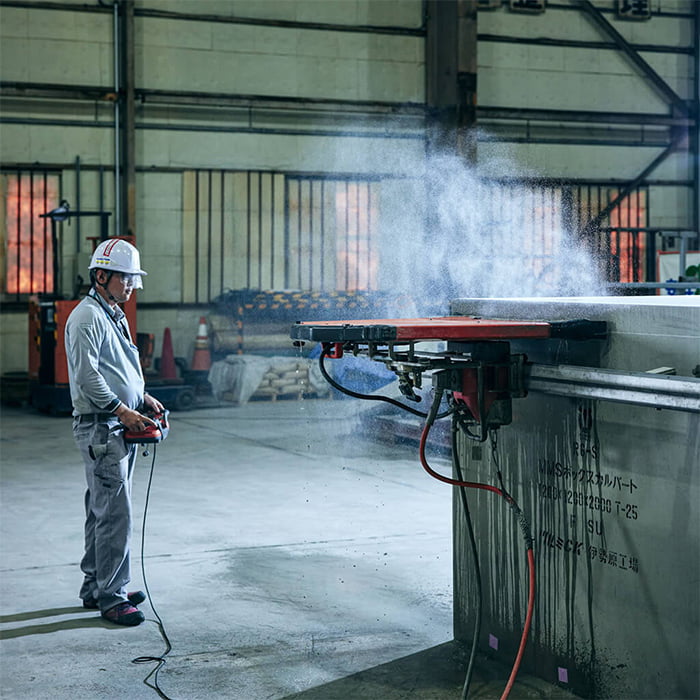 壁や床などの平面部分をダイヤモンドブレードで切断する、迅速かつ効率のよい工法です。ブレードの回転速度などは遠隔操作が可能。
