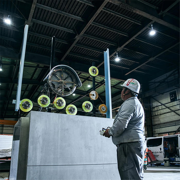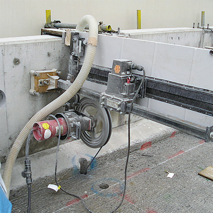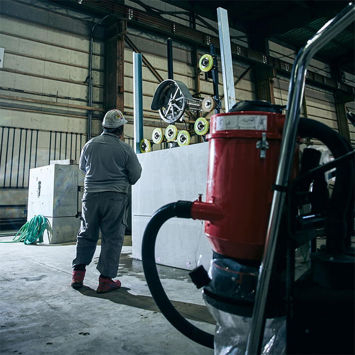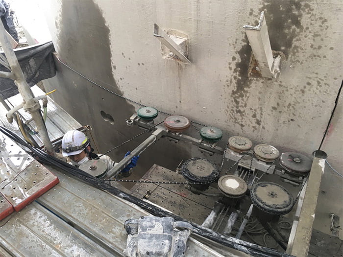 従来のワイヤーソーマシンに乾式専用ワイヤーを使用して切断する工法です。ワイヤーカバーを設置することにより、切削粉を同時回収し、粉塵を最小限に抑えて施工できます。給排水設備の設置が困難な、構造物撤去工事や建物改修工事等で多くの実績があります。