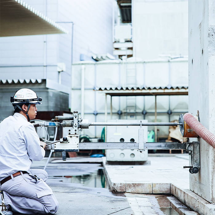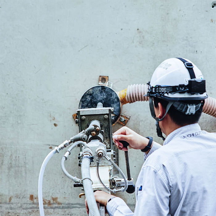 ウォータージェットは、鉄筋を損傷せずにコンクリートを削孔できるため構造物に優しく、耐久性の高い補修・補強工事が可能です。孔壁は、コアドリリングで削孔したような平滑な面ではなく、凹凸した面となるため、モルタル等の充填材がかみ合って、高いせん断・付着性能を確保できます。φ20~300㎜が可能。5000㎜以上の深さにも対応可能です。(実績値)