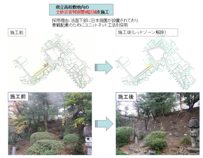 上記の写真は土砂災害特別警戒区域(レッドゾーン)に指定されている学校内の斜面をユニットネット工法で施工して指定区域を解除した事例です。