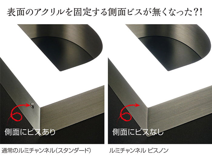 今までは表面のアクリルを固定するのに必要だった側面ビスを新構造の固定方法で、無くすことに成功しました。見上げのサインで目立っていた固定ビスも、ビスノンにすることで側面がスッキリ!