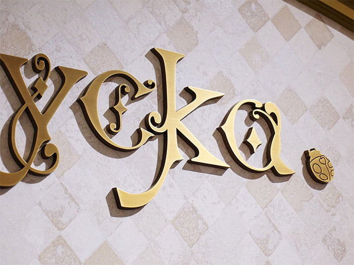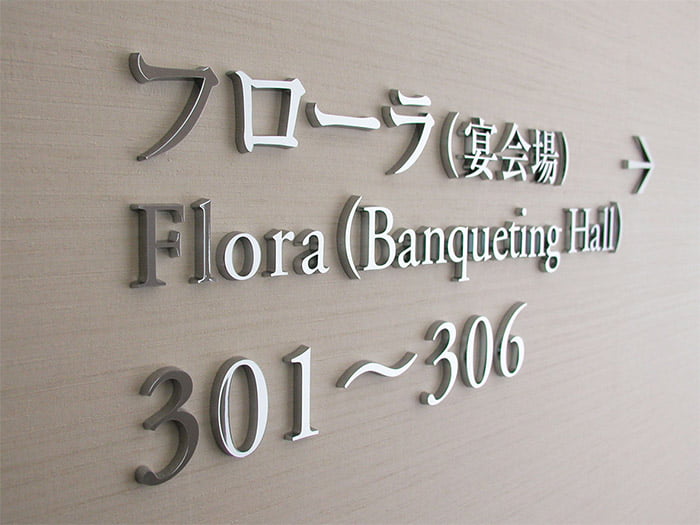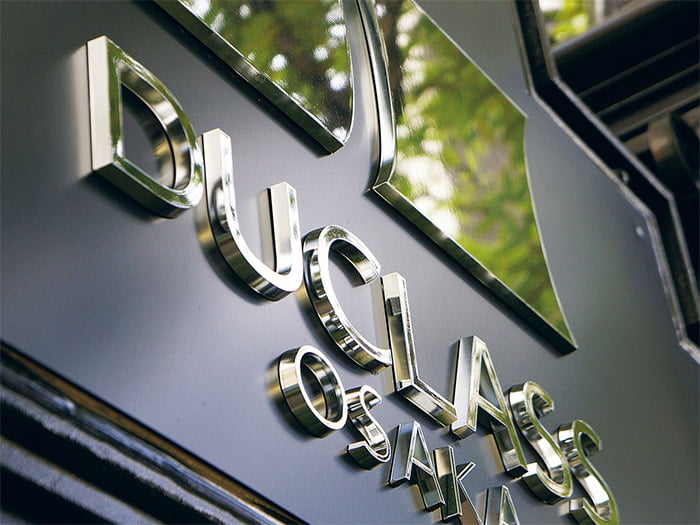 軽量が特徴のタフライトサイン(ABS樹脂製 金属メッキ切文字)。比重はステンレスの約1/7!