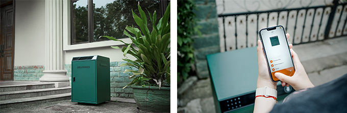 スマートフォン向け専用アプリと連携して、扉の開閉操作や利用履歴が確認できる屋外仕様の戸建向けスマート宅配ボックス。