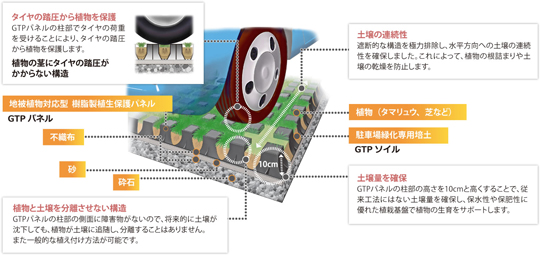 駐車場で植物を永続的に生育させることを可能にした駐車場緑化システムです。植物を苛酷な生育環境から守る工夫を随所に凝らした「GTPパネル」を使用し、緑あふれる駐車場をつくります。常緑で日陰に強いタマリュウを使用することで、芝では難しい条件(利用頻度の高い駐車場や建物の北側に位置する駐車場など)でも緑を維持できます。タマリュウは剪定頻度も低いため、管理にかかる負担を軽減できます。