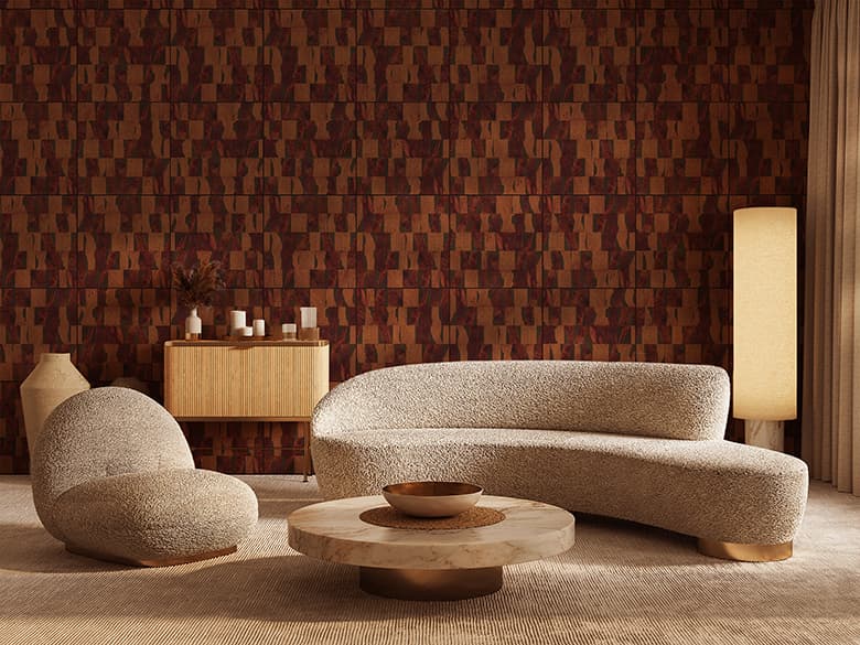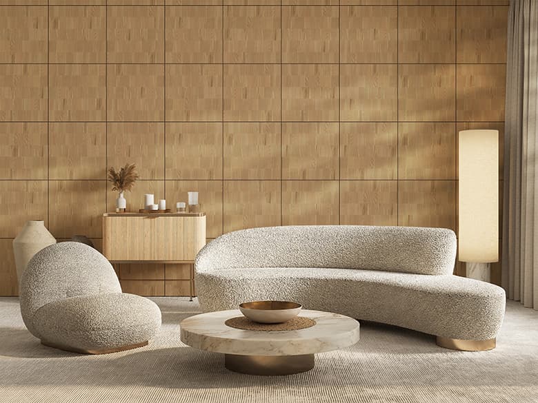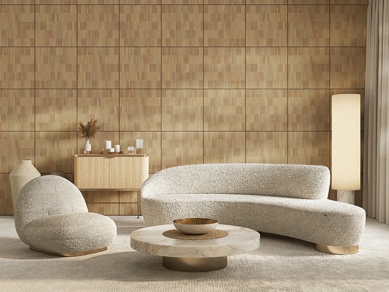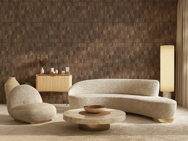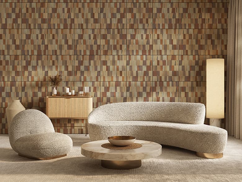 「Wood Brick」は、ツキ板の端材を活用した天然木化粧板で、不燃仕様と非不燃仕様をご用意しています。端材となったツキ板を裂き、レンガのように不規則に並べることで生まれる、有機的で独自の表情が特徴です。樹種ごとに異なる裂け具合や色味、質感の違いをデザインとして活かし、自然の豊かさをダイナミックに表現しています。