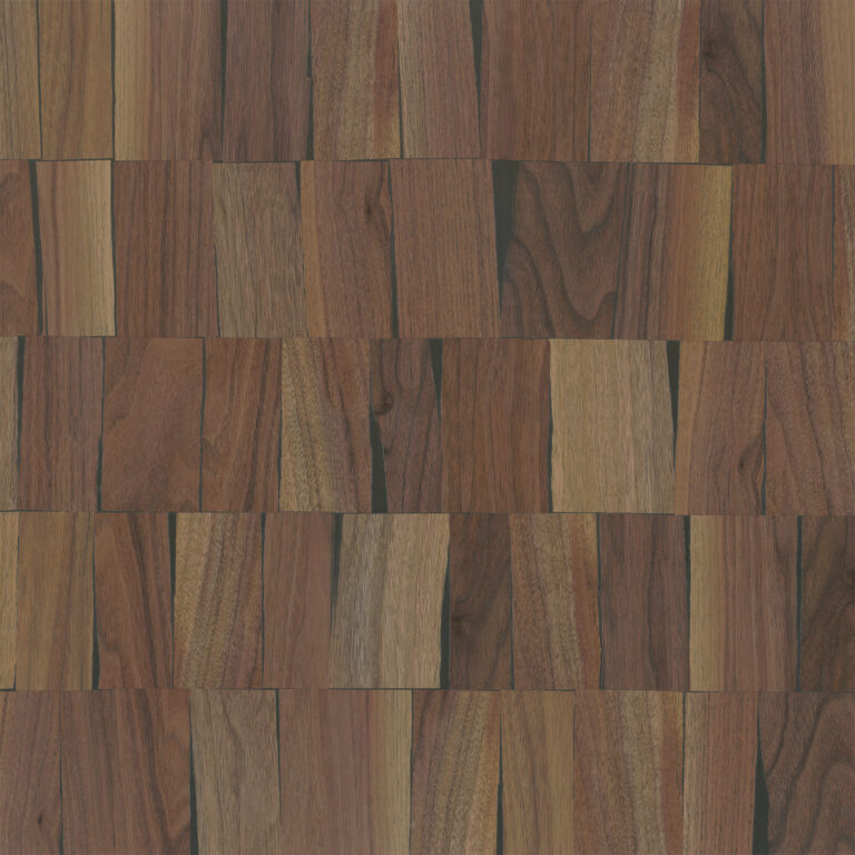 ツキ板の端材を裂き、レンガのように並べた独自の表情を持つ化粧板