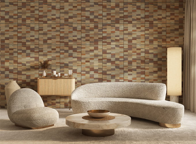 ツキ板の端材を裂き、レンガのように並べた独自の表情を持つ化粧板です。