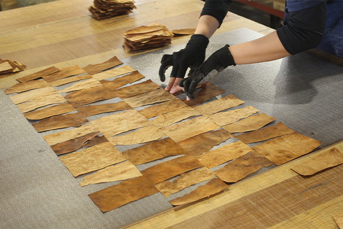 ▲ 手作業で貼り付け化粧板へと加工