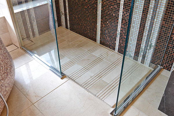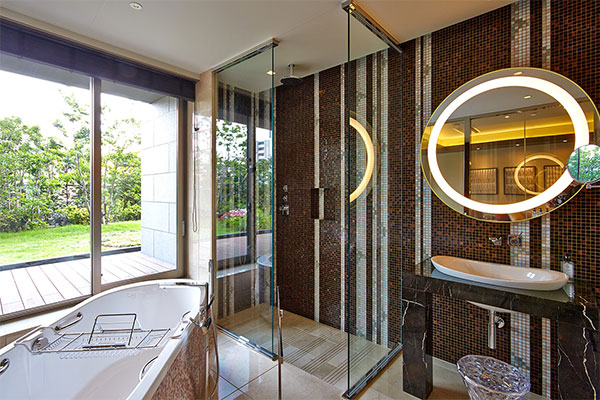 ガラスモザイクを貼った据置浴槽にシャワーブース