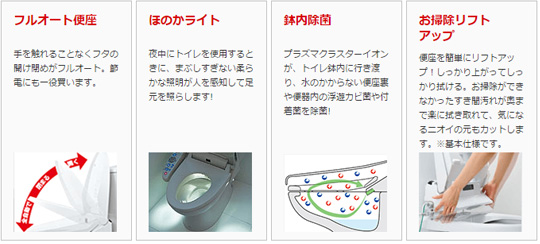 通常の機能にプラスした、フルオート便座・ほのかライト・鉢内除菌・お掃除リフトアップの機能が充実しました。