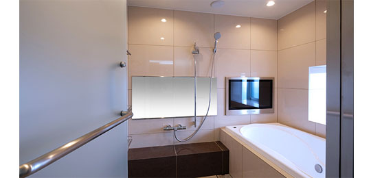 ・壁に32型のテレビを壁に埋め込みました。これは、天井にスピーカーが埋め込まれているため、音響も浴室全体に広がるところが特長です。