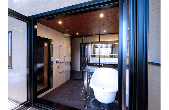浴室という仕切られた空間でありながら、ガラスや開口を巧みに使い、周りのスペースと一体となったような演出をする。