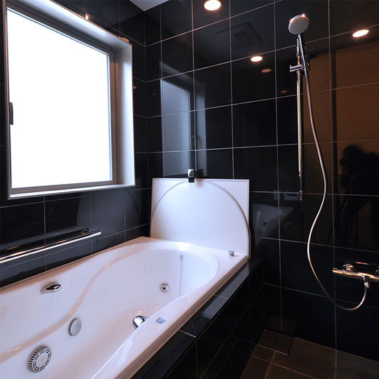 ・壁と浴槽デッキ・エプロンは黒の300角御影石貼り。全体の空間を引き締め、この上ない上質感をただよわせています。