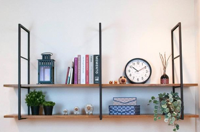 CRAFITS(クラフィッツ)棚収納は、マットブラック色のアイアン素材のフレームに、ナチュラルフィニッシュの天然木棚板を組み合わせた、壁付けシェルフです。
