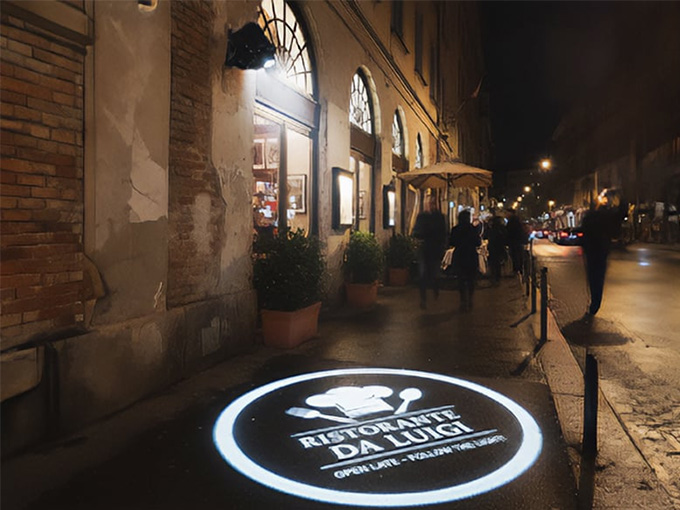 お店の宣伝部長!として ロゴプロジェクターはおすすめです。ついつい、目に入ってしまう!普通の看板との違いはココです!