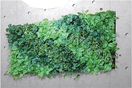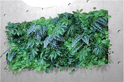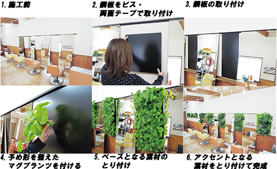 ■マグプランツの施工はとても簡単。取り着けたい場所に、約1mm厚のマグプランツ用鋼板を貼るだけなので、手軽な作業でベースを作る事ができます。鋼板に、あらかじめ形を整えたマグプランツを接着すれば、あっという間に緑の空間が完成です。季節ごとに葉材を変えても楽しめます。