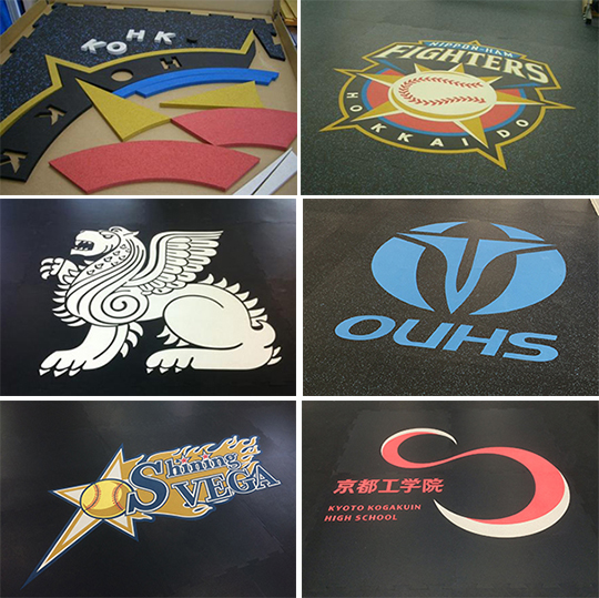 床面にロゴマーク等を入れることでオリジナルのフロアをつくることができます。ウォータージェットにて切り抜いたところに別の色のゴムをはめ込みます。印刷と違い、削れて消えるということがありません。