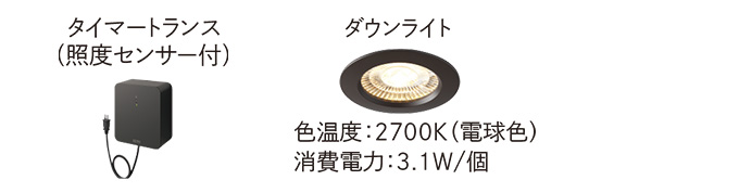新オプションとしてダウンライトが登場。日没後に自動点灯し、点灯時間は1~10時間の間で自由に設定できます。スッキリとした形状なので、昼までの目立たず、スタイリッシュに夜を照らします。