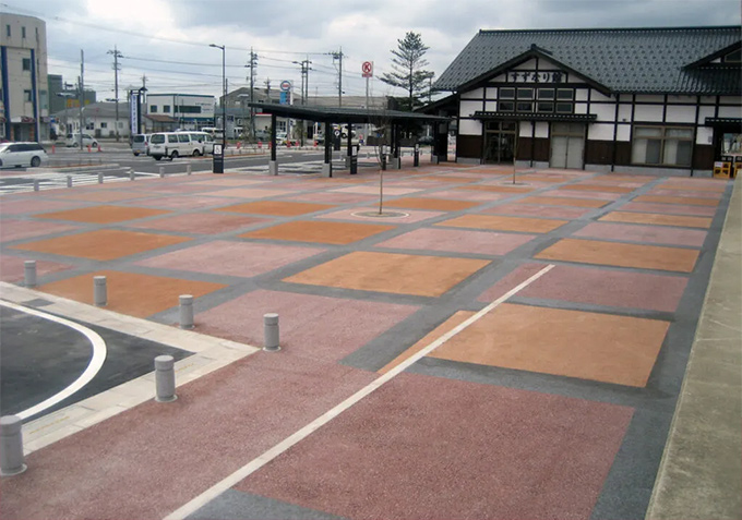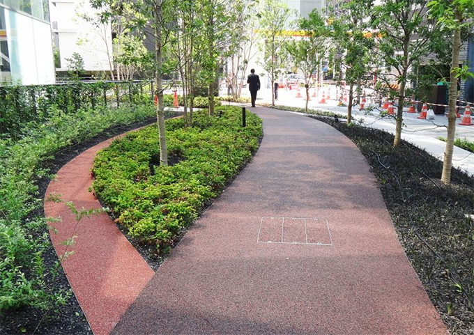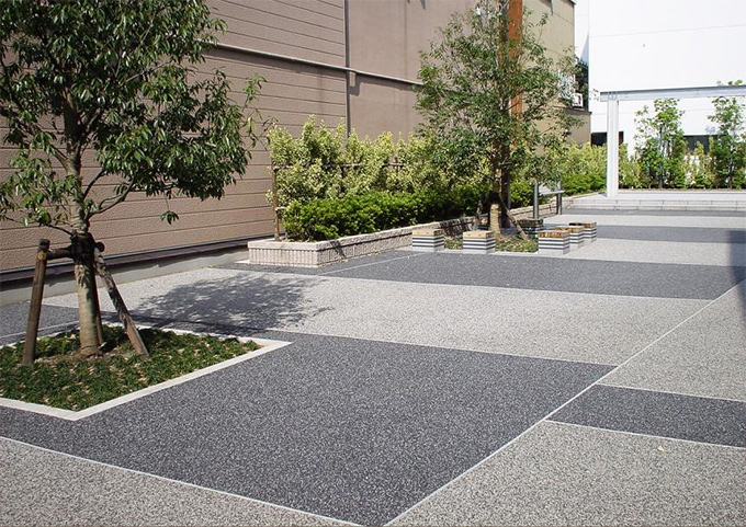 また透水性によって水溜まりができない、音の吸音性・分散性に優れるなどの機能性舗装が可能となる。
