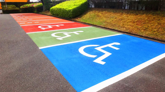 路側帯の歩道エリアや障がい者用駐車スペースなど、「色付けして視認性を高め、すべりにくくしたい」場所に重宝される。