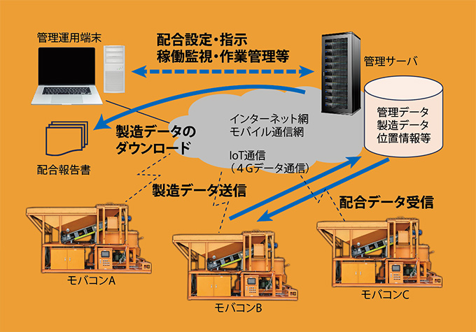 4Gデータ通信機能で、材料の製造データ(計量データ)を位置情報と共にクラウド上の管理サーバに自動で記録します。事務所等でPCやスマートフォンから現場の作業状況や生コン製造実績などを監視・管理し、製造データを配合報告書等に活用できます。