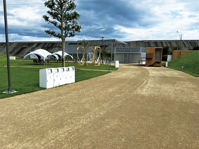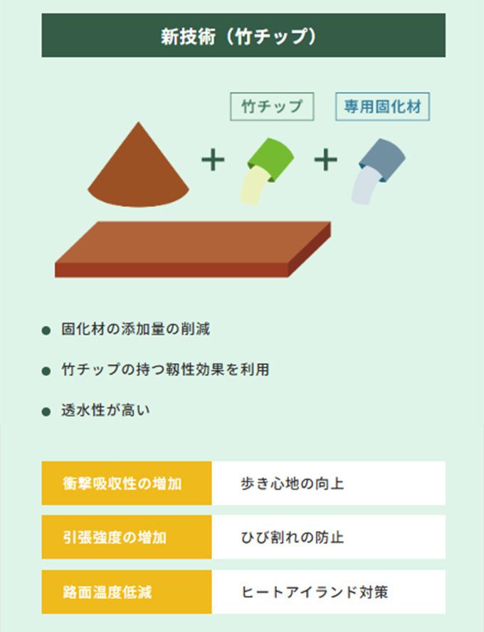 竹チップ舗装は歩行者系舗装の総称で、伐採・加工した“竹”を他の資材と混合し、敷き均しもしくは打設したものです。伐採した“竹”を有効利用できるほか、適度な柔らかさがあって歩きやすく、透水性・保水性があり、夏場においても舗装表面が熱くならない、 人工的でなく自然な趣があるなど、人と自然に優しい舗装です。景観性、ヒートアイランド対策等から、公園・緑地において注目されています。